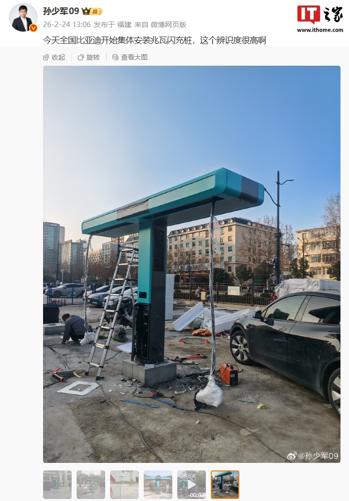 Параллельно в сети обсуждают и инфраструктуру. Еще в начале года пользователь @孙少少09 сообщил, что компания приступила к массовой установке мегаваттных зарядных устройств. На опубликованных изображениях заметен узнаваемый синий модуль с Т-образной компоновкой: кабель подвешен по краям «перекладины», что помогает избежать быстрого износа из-за лишней длины, а верхняя направляющая упрощает обращение с проводом. Официальных пояснений от BYD по этой теме пока нет, но IT House обещает следить за развитием событий (источник: ithome.com).