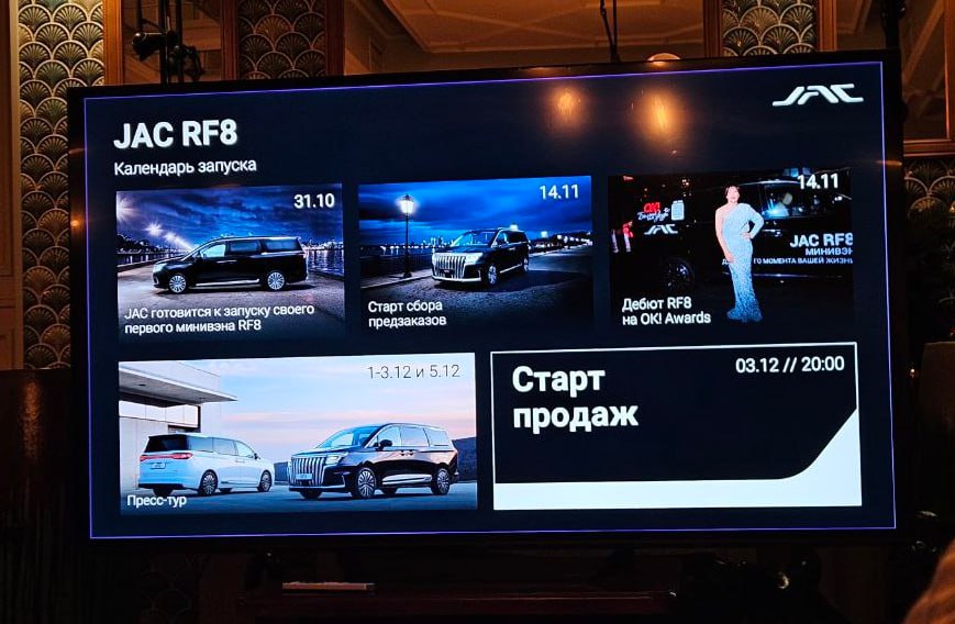Вечером 3 декабря на российском рынке стартуют официальные продажи нового минивэна JAC RF8 2025 — об этом сообщил Роман Яровой, корреспондент портала «Китайские автомобили», присутствовавший на презентации модели в рамках пресс-тура.
