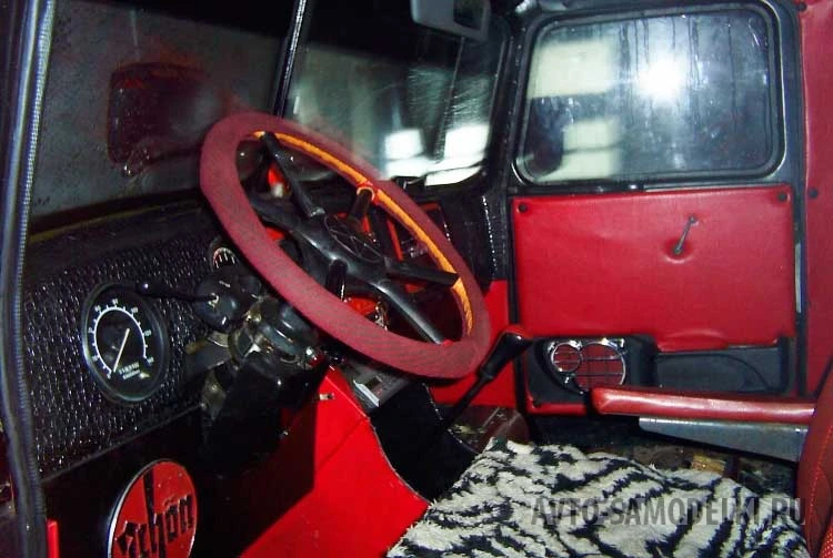 Салон автомобиля рассчитан на размещение шестерых человек: помимо передних кресел, сзади установлен широкий диван. Также, для комфортной эксплуатации в сильные морозы автор проекта оснастил кабину двумя отопителями от «Жигулей».